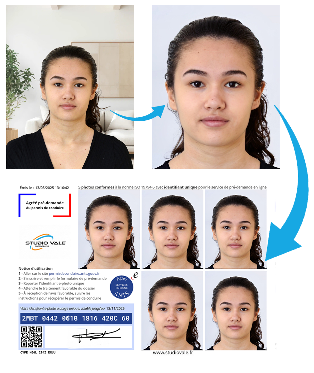 Commandez votre photo d’identité en ligne en quelques clics avec Studio Vale. Recevez rapidement une photo officielle, conforme aux normes ANTS et ePhoto, utilisable pour le permis de conduire, la carte d’identité, le passeport ou autre pays. Livraison express dans toute la France.